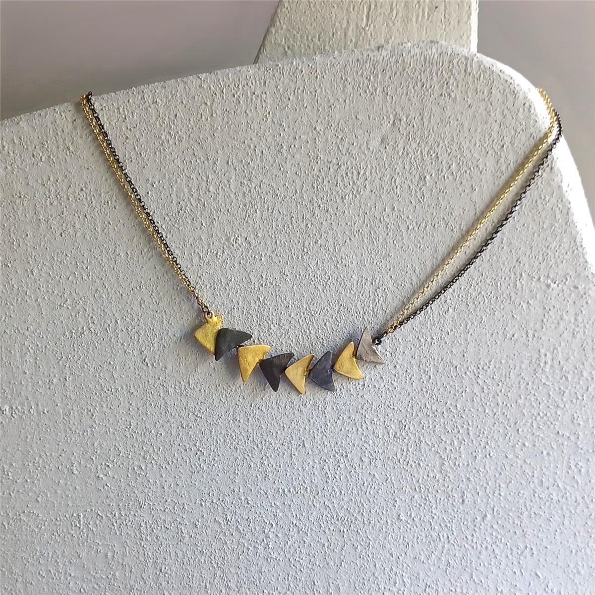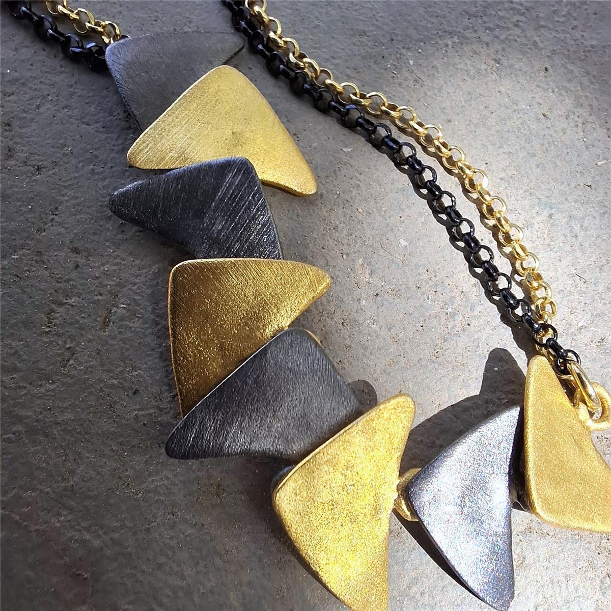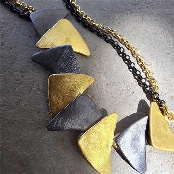 Silver goldplated and rhodiumplated geometric articulated necklace.